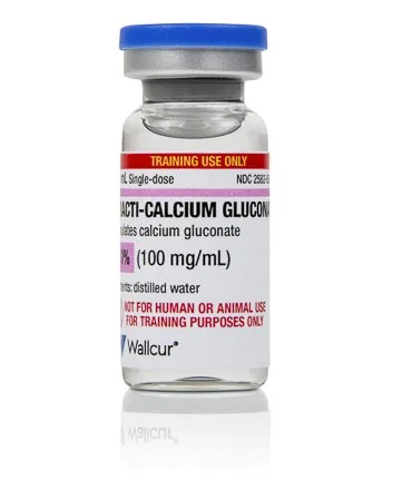 Practi-Calcium Gluconate™ (10 mL) vial for clinical training. The Practi-Calcium Gluconate™ 10% clear 10 mL vials simulate 10% calcium gluconate 100 mg/mL , used in the treatment of calcium deficiencies.