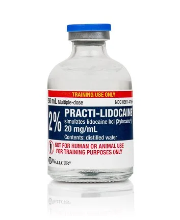Practi-Lidocaine 2%™ for clinical training, simulates Lidocaine 2% (Xylocaine 2%®) 1,000 mg/50 mL in a 50 mL vial, a medication used parenterally as a local anesthetic agent. Practi-Lidocaine 2% vials are filled with distilled water and are safe for use with manikins.
