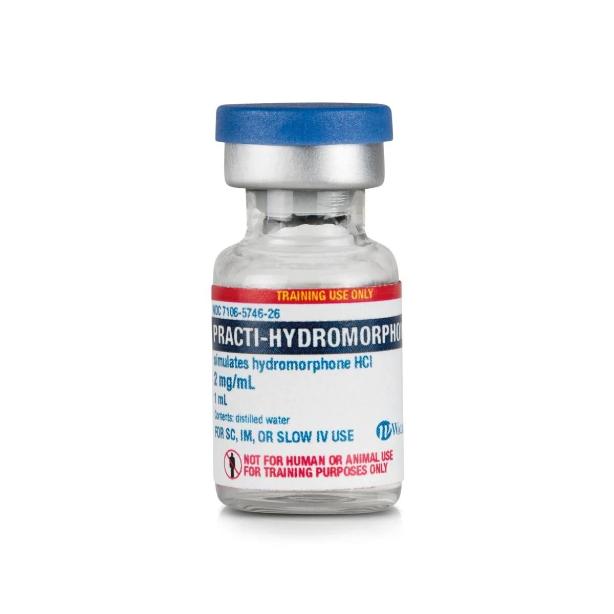 Wallcur's Practi-Hydromorphone™ for clinical training, simulates 2 mg/mL in a 1 mL clear vial