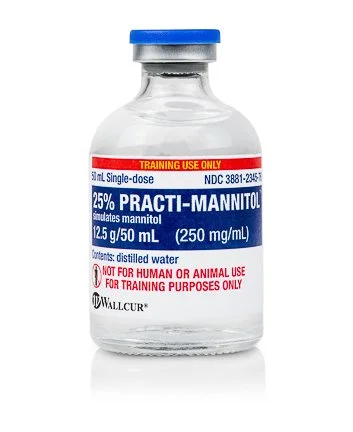 Practi-Mannitol™ 50 mL vial for clinical training. Wallcur's Practi-Mannitol™ 50 mL vials simulate 12.5 g/50 mL (250 mg/mL) of mannitol, a diuretic used in lung tests to diagnose asthma and other breathing problems. Contents: distilled water. Safe for use with manikins.