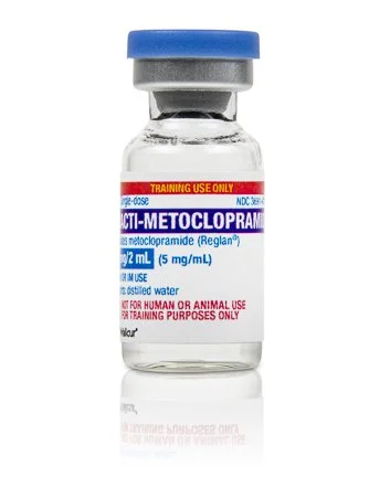 Practi-Metoclopramide™ (2 mL) for clinical training. Practi-Metoclopramide™ comes in a clear 2 mL vial simulating metoclopramide (Reglan®) 10 mg/2 mL, used for the relief of symptoms associated with acute and recurrent diabetic gastric stasis.