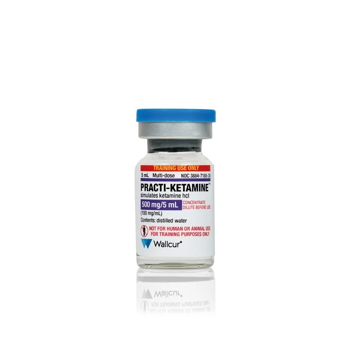 Practi-Ketamine™ 500 mg/5 mL vial for clinical training. Designed as an anesthetic commonly used in surgeries, to alleviate pain and discomfort during medical tests or procedures, and as a treatment for depression. It is also used in veterinary medicine