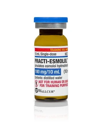 Practi-Esmolol™ for clinical training. Practi-Esmolol™ 100 mg/10mL tint vial is a distilled water 10 mL amber glass vial simulating the light-sensitive drug esmolol (Brevibloc®), a beta blocker used to treat heart rhythm problems or slow down a fast heartbeat and treat high blood pressure during or after surgery.