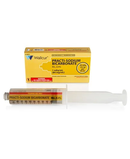 Practi-Sodium Bicarbonate™ 8.4% I.V. (84 mg/mL) 50 mL pre-filled luer lock syringe is for clinical training only. Wallcur's Practi-Sodium Bicarbonate simulates the systemic alkalinizing agent and electrolyte, sodium bicarbonate, a code drug used for your ACLS training scenarios, nursing skills lab, EMT field training simulations, and more.